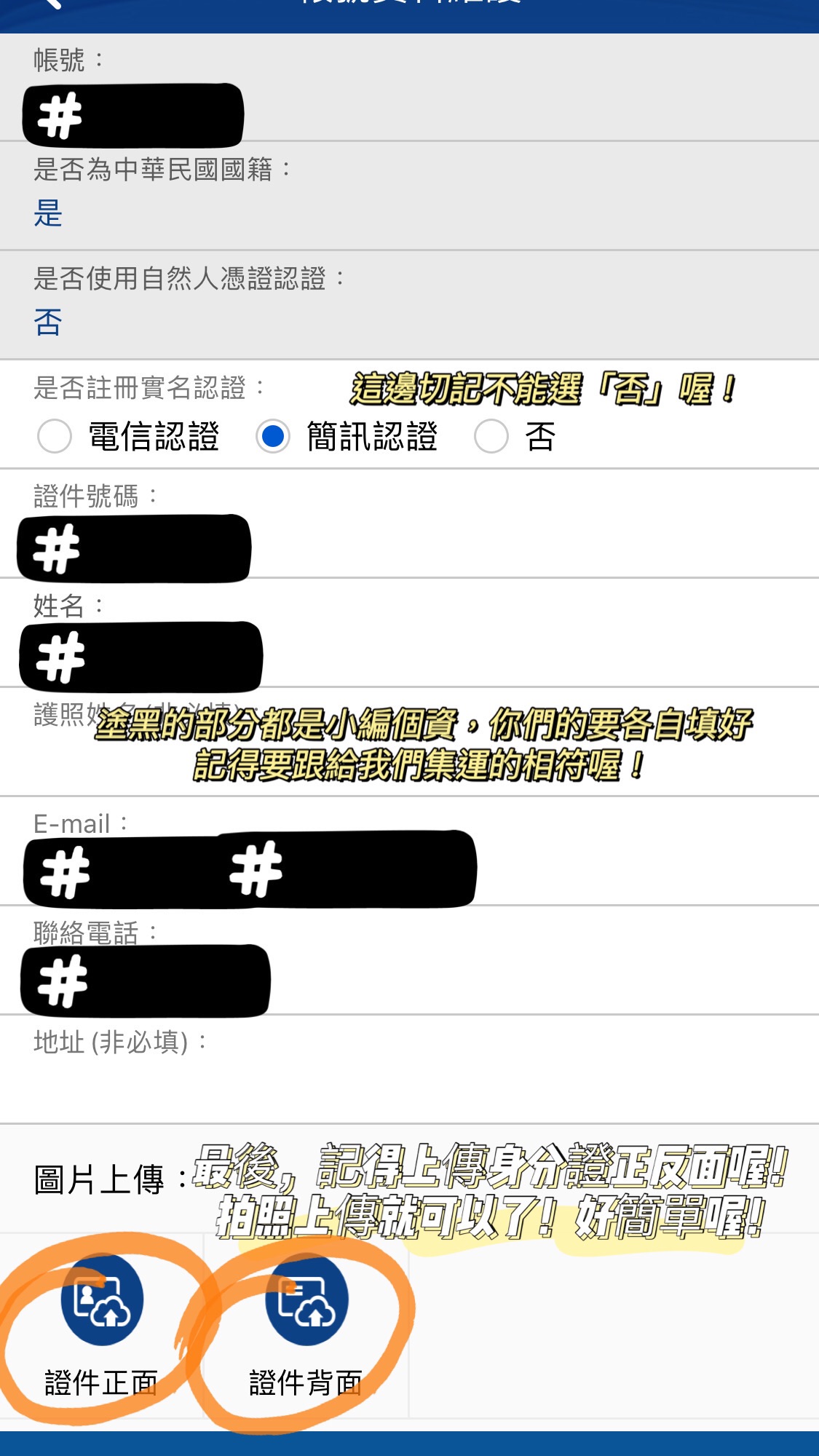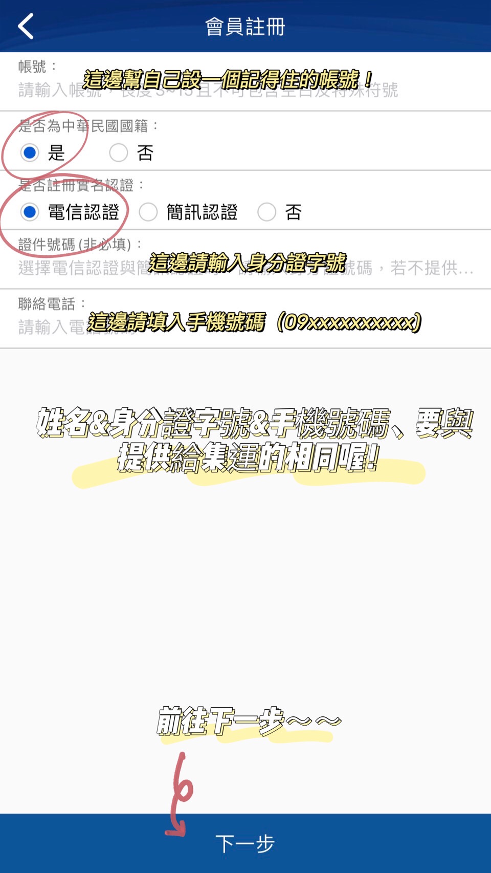 步驟二: "會員註冊" , 為自己設置一個帳號, 選擇電信認證或者簡訊認證都可以,就是不能選"否"喔.