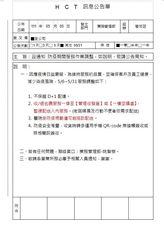 新竹物流公告,5/6~5/31服務調整如下: