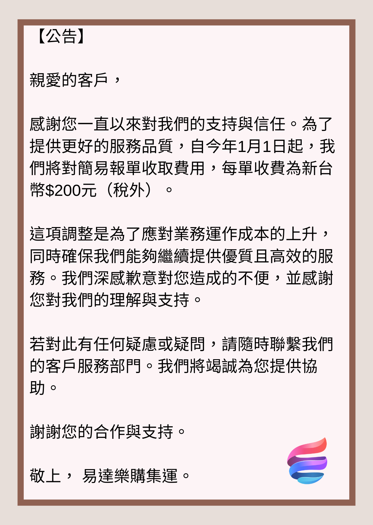 為提供更優質的服務並應對業務成本上升,我們決定自今年1月1日起對簡易報單收取每單新台幣$200元(稅外)的費用。然而,請注意以下兩點: