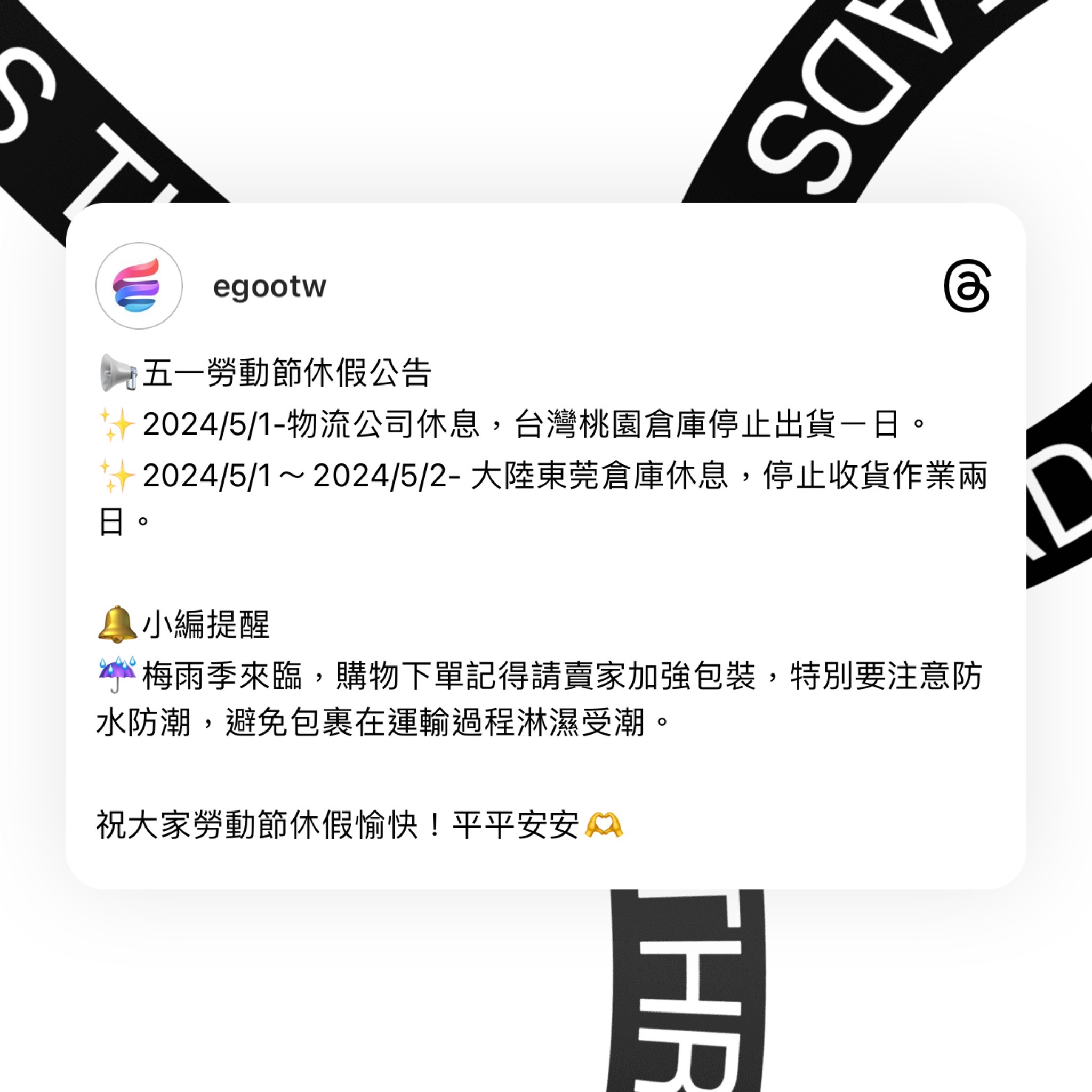臺灣段快遞公司五一勞動節休假期間休息不收貨不派送唷! 如果想確認目前已出貨訂單是否可以於連假前送達, 可以與您的配送站所進一步確認~ 每個站所都些許有些加班司機, 路線就要跟他們確認才會知道了!